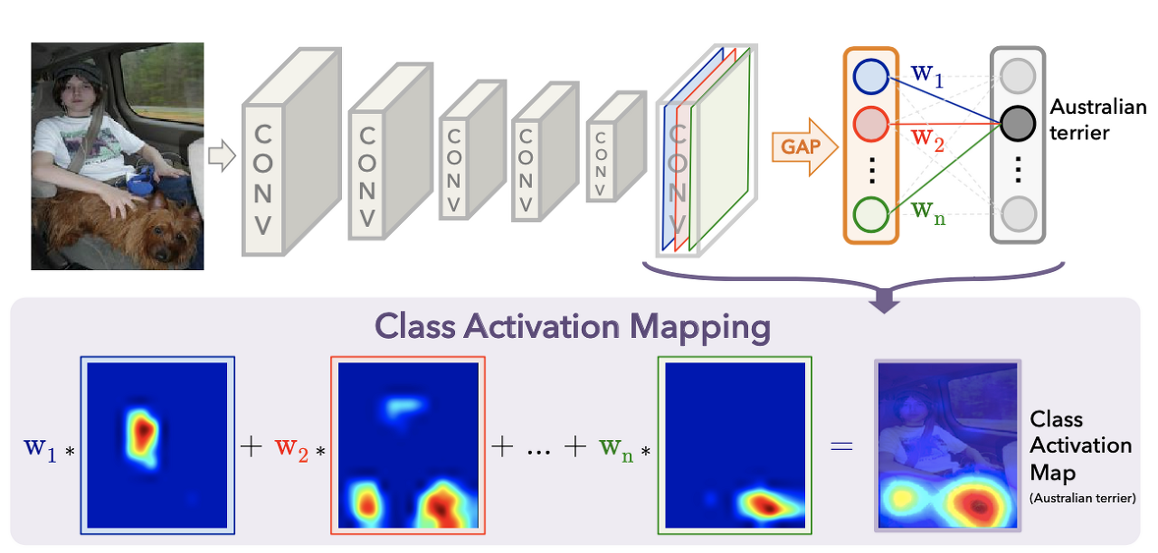 CAM은 GAP이 제공하는 정보를 활용해 CNN의 분류 결과에 대해 설명하는 기능을 제공합니다.