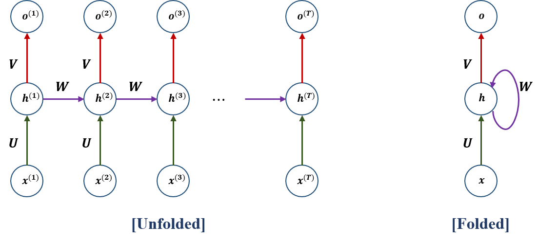- i 순간의 x_i는 가중치 U를 통해 은닉층의 상태 h_i에 영향을 미치고, h_i는 가중치 V를 통해 출력값 o_i에 영향을 미침. h_i-1는 가중치 W를 통해 h_i에 영향을 미침